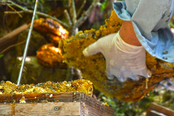 本来ならば、きれいに持ち上げることができる巣だが、蜜がたっぷりと詰まった巣は持ち上げることができない。そこを巧みに取り出していく名人芸。周りには多くの二ホンミツバチが飛び回り、満義さんの服の中にも数匹ハチが入り込み、どうやら何ヶ所か刺されていたようだが、動じず、黙々とハチの巣を取り出してゆく。