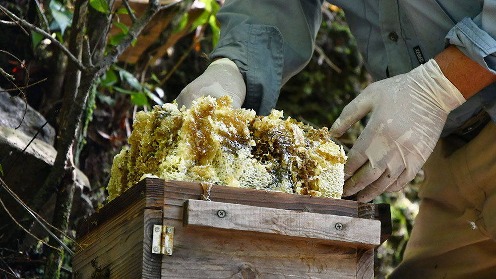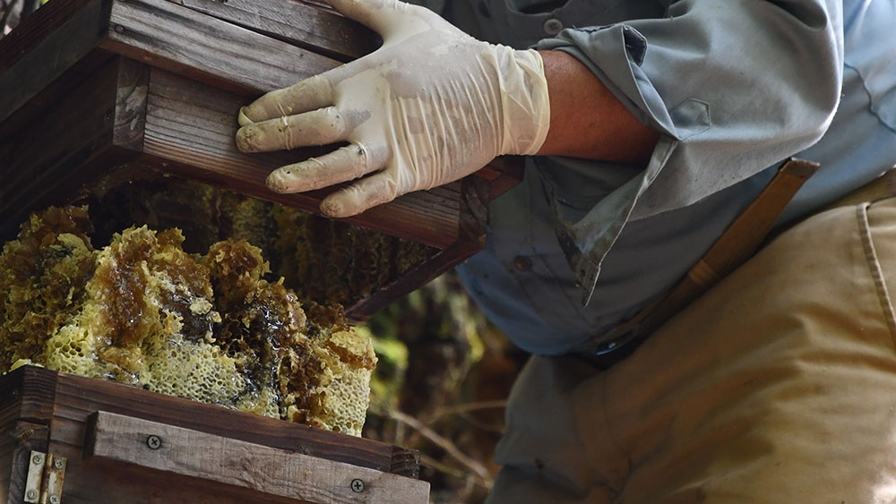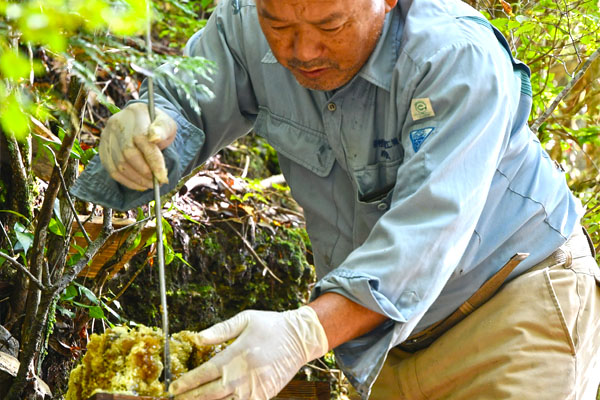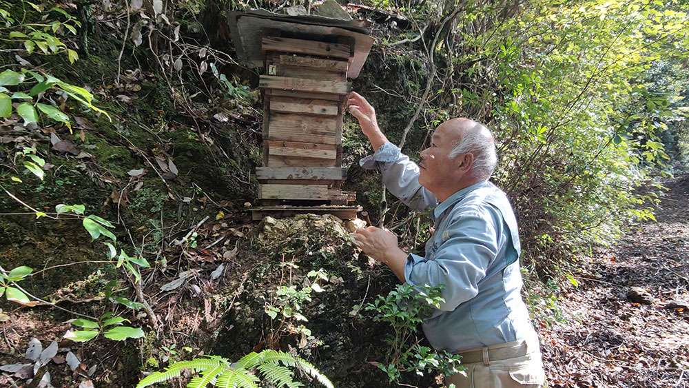 巣箱の置いてある場所は道から手が届くといっても山肌にあるため、足場のない不安定なところだ。70歳を超えたとは思えない強靭な足腰で力強く一歩を踏み出した。蓋を開けようとすると、なかなか持ち上がらない。蜜がたっぷり詰まっているのだ。