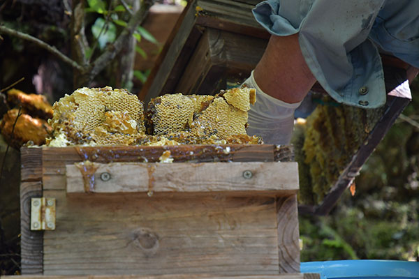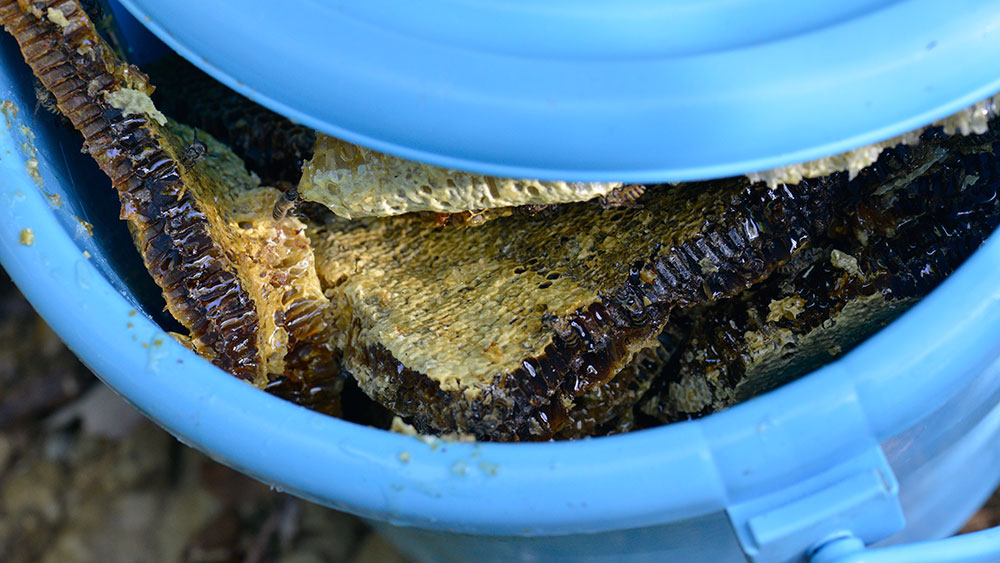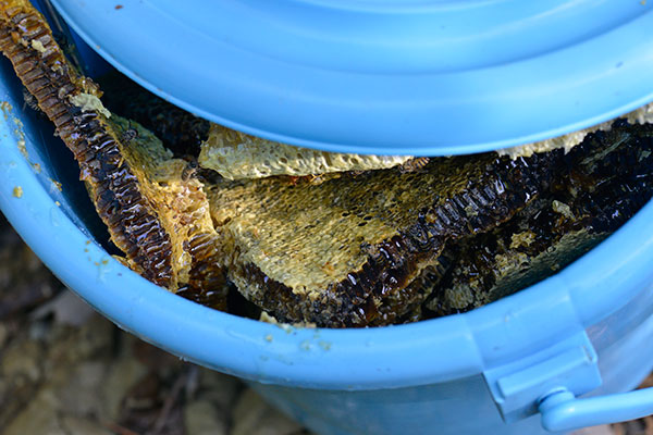 用意していた青いポリバケツは、蜜でいっぱいになり、蓋が閉まらないほどになった。巣箱を覗き込んでみると、まだ複数の巣がそのまま残されていた。「すべてを取らないのですか?」と質問をすると、「すべて取ってしまうとハチたちが冬を越せなくなってしまうからね。自分たちが食べる分をハチたちに分けてもらう・・・。おすそ分けをいただいているって感じかな」と、一寸はにかみ伝えてくれた。
