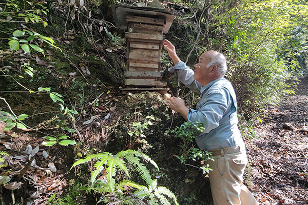 「凄いところですね!」と高まった気持ちを抑えながら話しかけると、「ここの巣箱は道から手が届く場所に設置してある。他の現場はもっと急斜面。以前30mほど滑落して、ドクターヘリで運ばれたことがあったよ」と話す満義さんの笑顔は、まぶしかった。